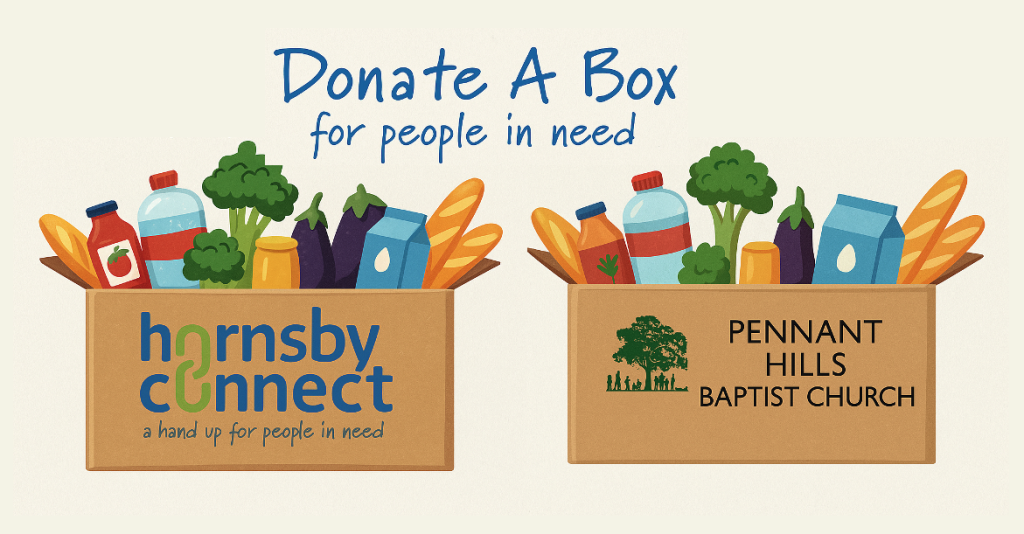 The partnership that Pennant Hills Baptist Church has formed with Hornsby Connect is a practical way for members of the church to live out Jesus’ command to feed the hungry. Donations made through this page will be used to purchase food from Hornsby Connect for families in need who are supported by the church, at no cost to those families. All donations are greatly appreciated but we encourage you to consider donating a sufficient number of boxes, at $15 per box, to feed a family for a significant period of time. Donations are tax deductible. Please note that if PHBC donations are more than is needed to support families associated with the church, some funds may be used to support other Hornsby Connect clients. Any such use of PHBC donations would be at the discretion of the church.